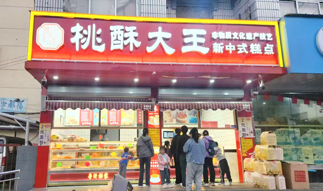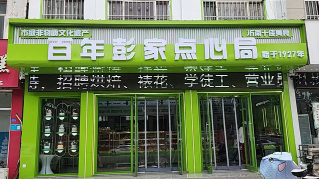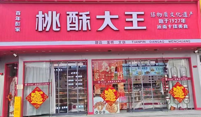 2005年,彭宝灯正式接手家中的糕点铺,成为彭氏传统糕点制作技艺的传承人。他深知自己接过的不仅仅是赖以谋生的案板与炉具,更是家族四代人坚守的手艺根脉,是家族文化的延续。初掌糕点铺的他,毫无半分懈怠,与家人并肩打拼。从简陋的路边摊做起,父亲每日外出赶集售卖,他便守着门头,与妻子一同揉面、制坯、烘烤。凭借地道的味道、实在的用料、诚信的经营,慢慢在当地积累下了良好的口碑。2006年,彭宝灯在沂南县城开设了第一家彭氏糕点分店,2007年又创立“桃酥大王”、“鲁沂彭家”特色品牌。此后,他的生意越做越红火,巅峰时期拥有六七家门店,彭氏糕点的酥香飘满了沂南的街头巷尾。彼时的他,虽尚未完全领悟“传承”二字的深层含义,却以最质朴的坚持与最踏实的行动,让这份家族老手艺延续下去,也为日后的发展壮大打下来坚实的基础。